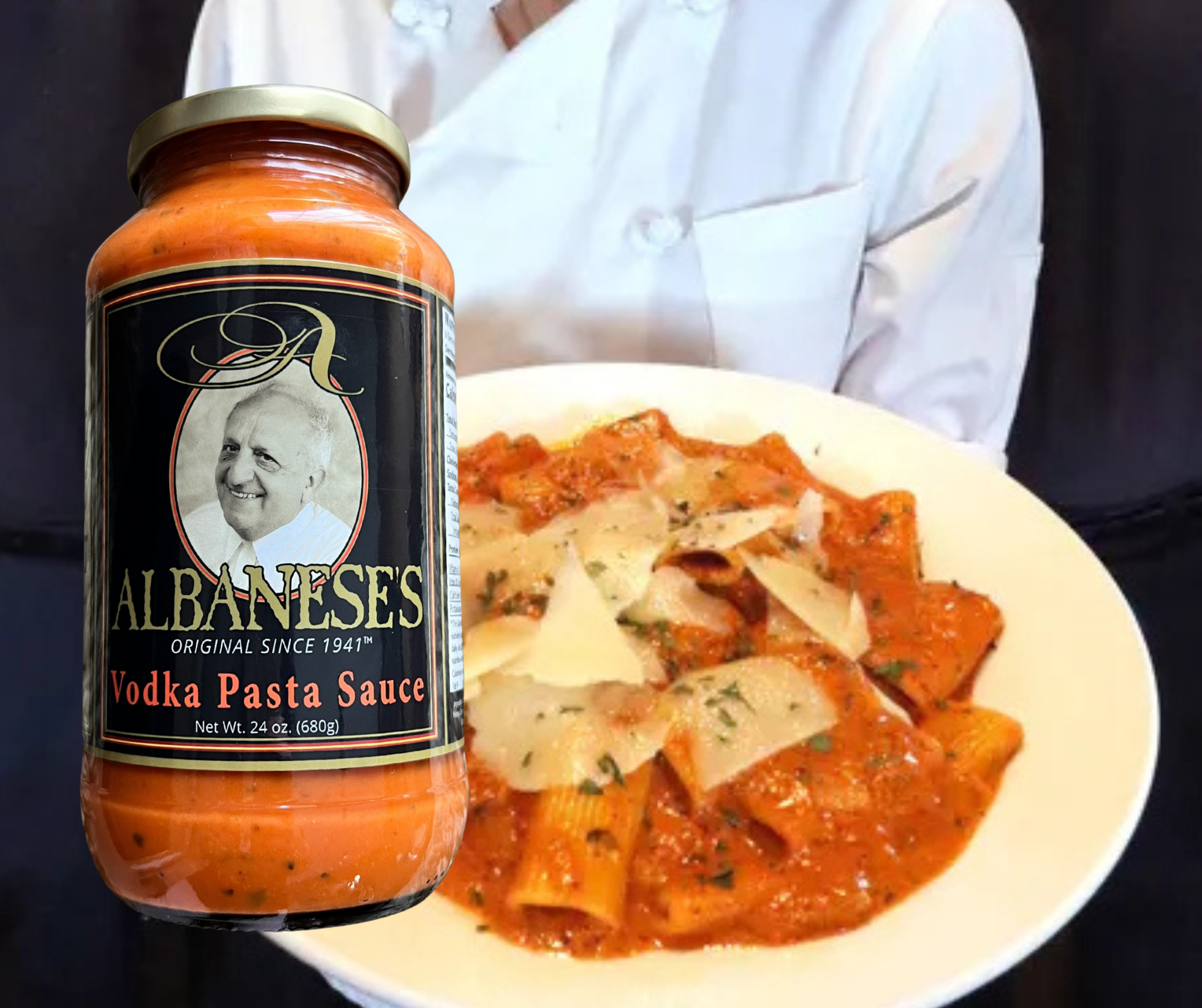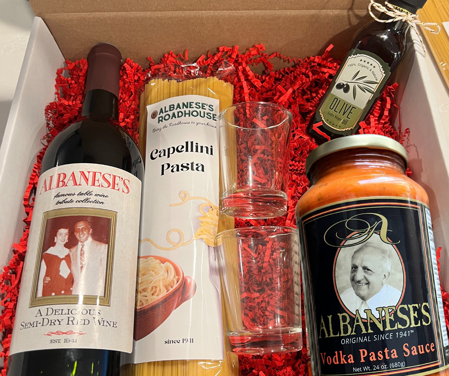 Includes: 1 bottle of Albanese’s famous house wine, 2 old school Italian wine glasses, 1 jar of Albanese’s VODKA sauce, 1 pound of Albanese’s Capellini and a 4oz jar of organic extra virgin olive oil.